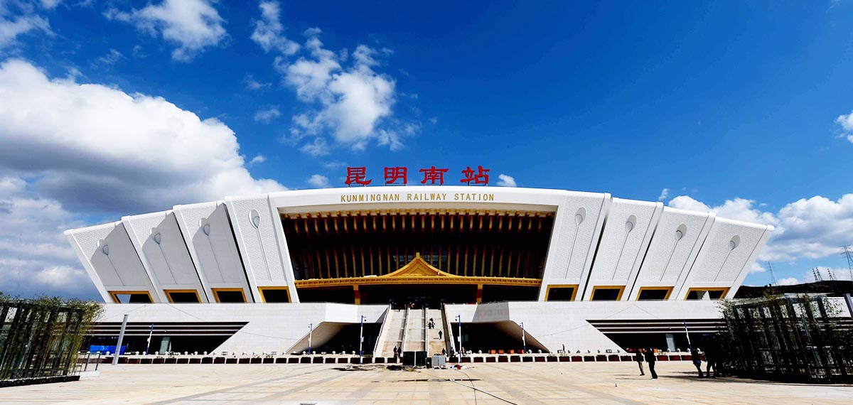 昆明南站(Kunming Nan Railway Station):位于云南省昆明市呈貢區(qū)吳家營街道白龍?zhí)渡侥_之西,坐東向西,東邊是山區(qū),西距昆明市政府大樓約3公里、滇池約7公里,南面是西南聯(lián)大舊址和呈貢大學(xué)城,北距昆明站約28公里。正面造型為孔雀開屏、鮮花綻放。